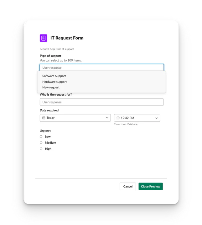 Our dashboard means you never have to leave Slack or have your team learn a new system. Need to update a Form? You can edit or preview Forms all within the dashboard.