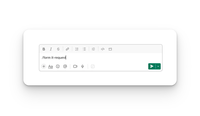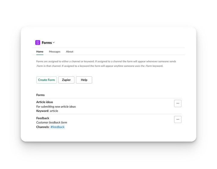 Assign Forms to a particular channel and use the /form command to automatically open it. Want to have your Form available in any Slack channel? Assign it a keyword like "lunch" and trigger it using /form lunch .