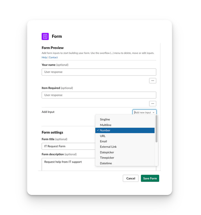 The fully embedded Form Creator lets you add many different input types including channel selectors, custom drop downs and datepickers without ever leaving Slack. Give your inputs a title and description and adjust settings to capture the information you need.