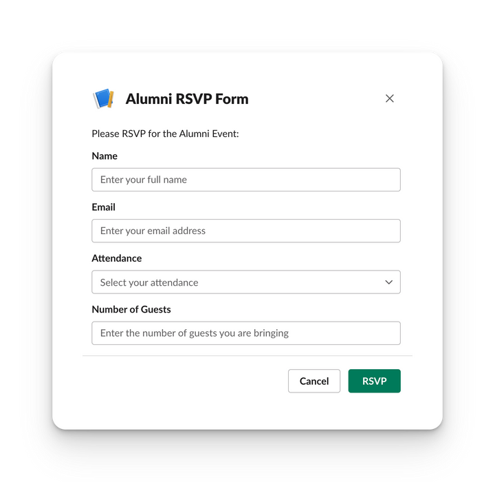 RSVP for the Alumni Event with ease using this form in Slack! Enter your name, email, select your attendance preference, and indicate the number of guests you're bringing. Don't miss out on this opportunity to connect with fellow alumni!