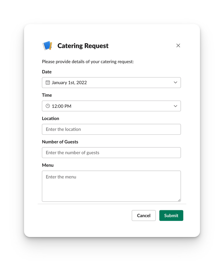 {"type":"modal","title":{"type":"plain_text","text":"Catering Request","emoji":true},"submit":{"type":"plain_text","text":"Submit","emoji":true},"close":{"type":"plain_text","text":"Cancel","emoji":true},"blocks":[{"type":"section","block_id":"catering_title","text":{"type":"mrkdwn","text":"Please provide details of your catering request:"}},{"type":"input","block_id":"catering_date","element":{"type":"datepicker","initial_date":"2022-01-01","placeholder":{"type":"plain_text","text":"Select a date","emoji":true}},"label":{"type":"plain_text","text":"Date","emoji":true}},{"type":"input","block_id":"catering_time","element":{"type":"timepicker","initial_time":"12:00","placeholder":{"type":"plain_text","text":"Select a time","emoji":true}},"label":{"type":"plain_text","text":"Time","emoji":true}},{"type":"input","block_id":"catering_location","element":{"type":"plain_text_input","action_id":"catering_location_input","placeholder":{"type":"plain_text","text":"Enter the location","emoji":true}},"label":{"type":"plain_text","text":"Location","emoji":true}},{"type":"input","block_id":"catering_guests","element":{"type":"plain_text_input","action_id":"catering_guests_input","placeholder":{"type":"plain_text","text":"Enter the number of guests","emoji":true}},"label":{"type":"plain_text","text":"Number of Guests","emoji":true}},{"type":"input","block_id":"catering_menu","element":{"type":"plain_text_input","action_id":"catering_menu_input","multiline":true,"placeholder":{"type":"plain_text","text":"Enter the menu","emoji":true}},"label":{"type":"plain_text","text":"Menu","emoji":true}}]}About Forms for Slack