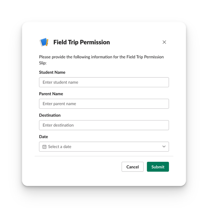 Open this the form in any Slack channel using the slash command: /form Field Trip Permission Slip