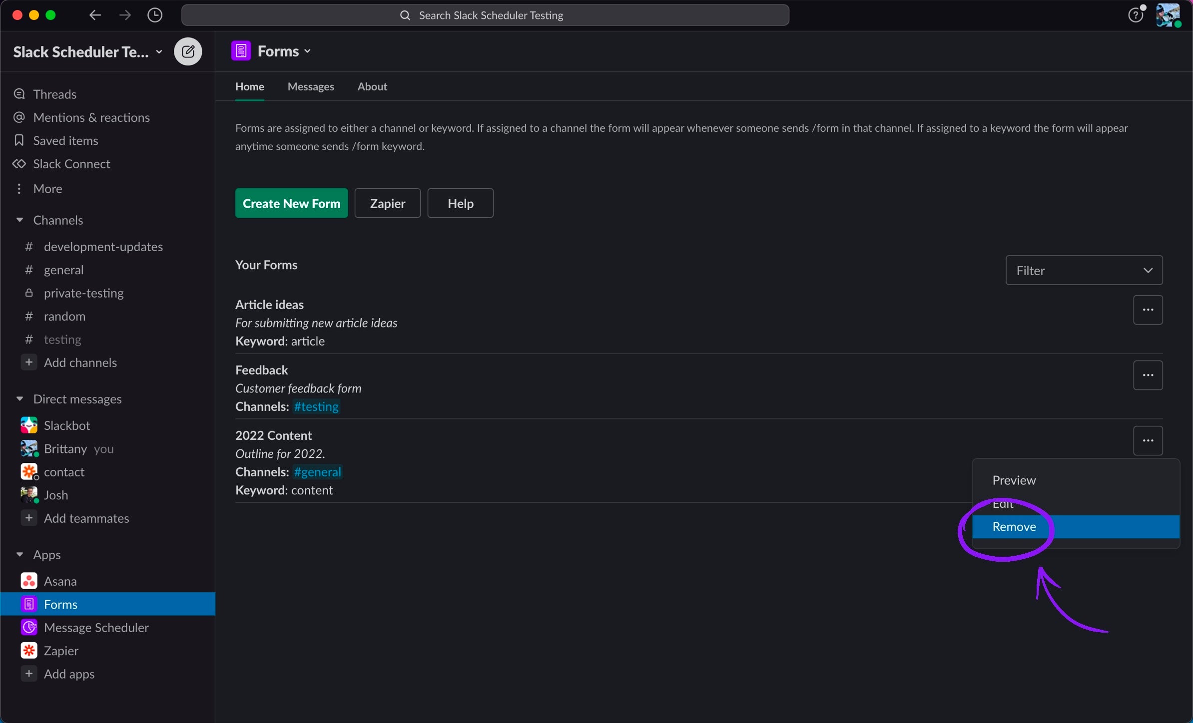 3. Find your form and click on the right drop down menu of the form you wish to delete and select 'Remove'.