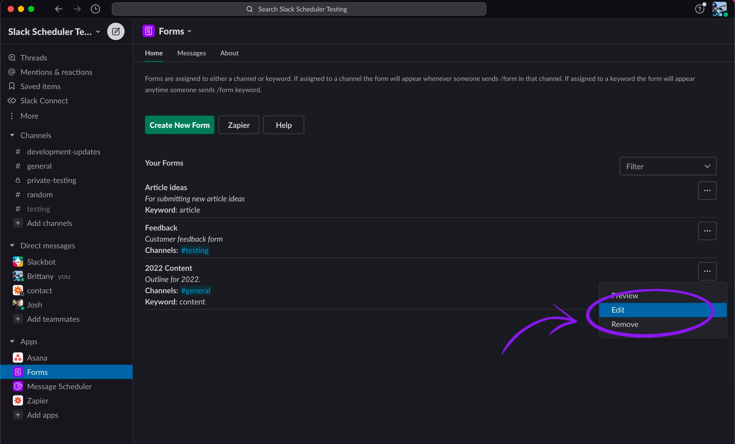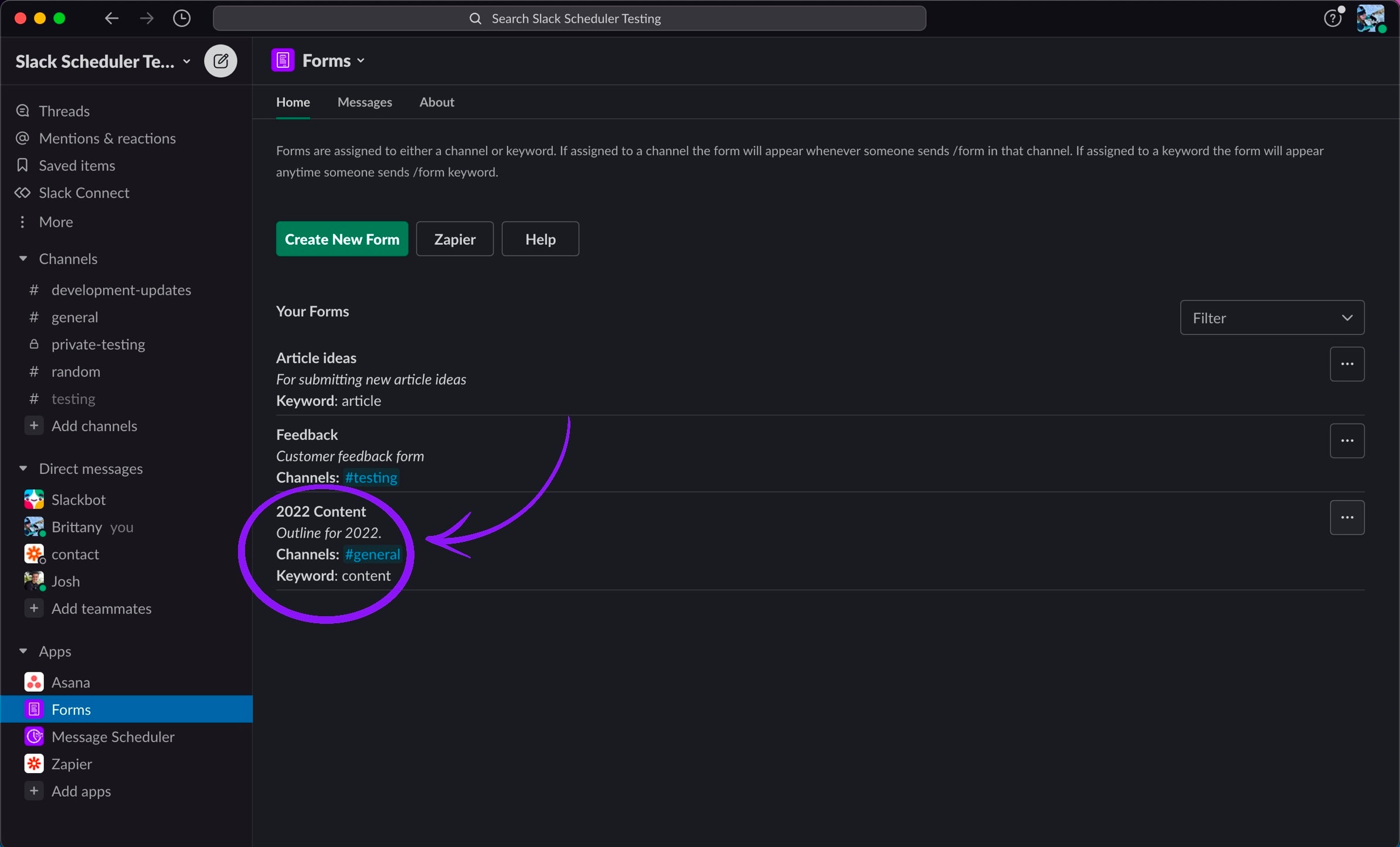 1. Go to the 'Apps' drop down menu on the left side of your Slack workspace - this brings up the Forms dashboard.