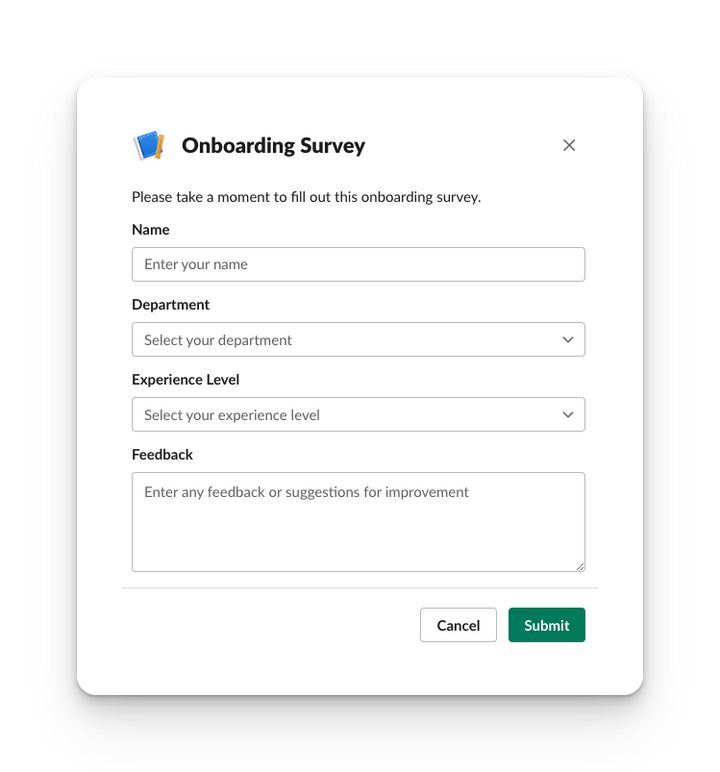 {"type":"modal","title":{"type":"plain_text","text":"Onboarding Survey","emoji":true},"submit":{"type":"plain_text","text":"Submit","emoji":true},"close":{"type":"plain_text","text":"Cancel","emoji":true},"blocks":[{"type":"section","block_id":"survey_intro","text":{"type":"mrkdwn","text":"Please take a moment to fill out this onboarding survey."}},{"type":"input","block_id":"survey_name","element":{"type":"plain_text_input","action_id":"survey_name_input","placeholder":{"type":"plain_text","text":"Enter your name","emoji":true}},"label":{"type":"plain_text","text":"Name","emoji":true}},{"type":"input","block_id":"survey_department","element":{"type":"static_select","placeholder":{"type":"plain_text","text":"Select your department","emoji":true},"options":[{"text":{"type":"plain_text","text":"Sales","emoji":true},"value":"sales"},{"text":{"type":"plain_text","text":"Marketing","emoji":true},"value":"marketing"},{"text":{"type":"plain_text","text":"Engineering","emoji":true},"value":"engineering"}]},"label":{"type":"plain_text","text":"Department","emoji":true}},{"type":"input","block_id":"survey_experience","element":{"type":"static_select","placeholder":{"type":"plain_text","text":"Select your experience level","emoji":true},"options":[{"text":{"type":"plain_text","text":"Entry-level","emoji":true},"value":"entry"},{"text":{"type":"plain_text","text":"Mid-level","emoji":true},"value":"mid"},{"text":{"type":"plain_text","text":"Senior-level","emoji":true},"value":"senior"}]},"label":{"type":"plain_text","text":"Experience Level","emoji":true}},{"type":"input","block_id":"survey_feedback","element":{"type":"plain_text_input","action_id":"survey_feedback_input","multiline":true,"placeholder":{"type":"plain_text","text":"Enter any feedback or suggestions for improvement","emoji":true}},"label":{"type":"plain_text","text":"Feedback","emoji":true}}]}About Forms for Slack