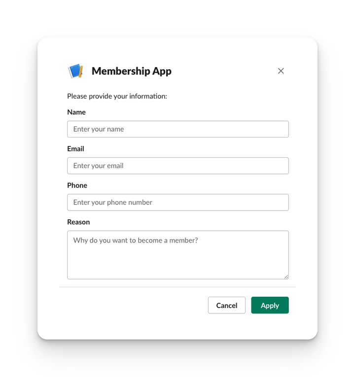 {"type":"modal","title":{"type":"plain_text","text":"Membership App","emoji":true},"submit":{"type":"plain_text","text":"Apply","emoji":true},"close":{"type":"plain_text","text":"Cancel","emoji":true},"blocks":[{"type":"section","block_id":"membership_info","text":{"type":"mrkdwn","text":"Please provide your information:"}},{"type":"input","block_id":"membership_name","element":{"type":"plain_text_input","action_id":"membership_name_input","placeholder":{"type":"plain_text","text":"Enter your name","emoji":true}},"label":{"type":"plain_text","text":"Name","emoji":true}},{"type":"input","block_id":"membership_email","element":{"type":"plain_text_input","action_id":"membership_email_input","placeholder":{"type":"plain_text","text":"Enter your email","emoji":true}},"label":{"type":"plain_text","text":"Email","emoji":true}},{"type":"input","block_id":"membership_phone","element":{"type":"plain_text_input","action_id":"membership_phone_input","placeholder":{"type":"plain_text","text":"Enter your phone number","emoji":true}},"label":{"type":"plain_text","text":"Phone","emoji":true}},{"type":"input","block_id":"membership_reason","element":{"type":"plain_text_input","action_id":"membership_reason_input","multiline":true,"placeholder":{"type":"plain_text","text":"Why do you want to become a member?","emoji":true}},"label":{"type":"plain_text","text":"Reason","emoji":true}}]}About Forms for Slack