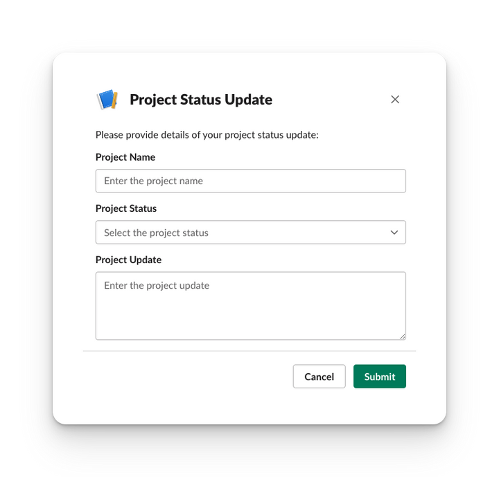 {"type":"modal","title":{"type":"plain_text","text":"Project Status Update","emoji":true},"submit":{"type":"plain_text","text":"Submit","emoji":true},"close":{"type":"plain_text","text":"Cancel","emoji":true},"blocks":[{"type":"section","block_id":"project_title","text":{"type":"mrkdwn","text":"Please provide details of your project status update:"}},{"type":"input","block_id":"project_name","element":{"type":"plain_text_input","action_id":"project_name_input","placeholder":{"type":"plain_text","text":"Enter the project name","emoji":true}},"label":{"type":"plain_text","text":"Project Name","emoji":true}},{"type":"input","block_id":"project_status","element":{"type":"static_select","placeholder":{"type":"plain_text","text":"Select the project status","emoji":true},"options":[{"text":{"type":"plain_text","text":"On Track","emoji":true},"value":"on_track"},{"text":{"type":"plain_text","text":"Delayed","emoji":true},"value":"delayed"},{"text":{"type":"plain_text","text":"Completed","emoji":true},"value":"completed"}]},"label":{"type":"plain_text","text":"Project Status","emoji":true}},{"type":"input","block_id":"project_update","element":{"type":"plain_text_input","action_id":"project_update_input","multiline":true,"placeholder":{"type":"plain_text","text":"Enter the project update","emoji":true}},"label":{"type":"plain_text","text":"Project Update","emoji":true}}]}About Forms for Slack
