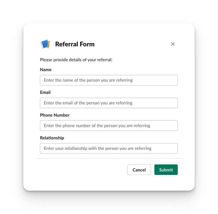 {"type":"modal","title":{"type":"plain_text","text":"Referral Form","emoji":true},"submit":{"type":"plain_text","text":"Submit","emoji":true},"close":{"type":"plain_text","text":"Cancel","emoji":true},"blocks":[{"type":"section","block_id":"referral_title","text":{"type":"mrkdwn","text":"Please provide details of your referral:"}},{"type":"input","block_id":"referral_name","element":{"type":"plain_text_input","action_id":"referral_name_input","placeholder":{"type":"plain_text","text":"Enter the name of the person you are referring","emoji":true}},"label":{"type":"plain_text","text":"Name","emoji":true}},{"type":"input","block_id":"referral_email","element":{"type":"plain_text_input","action_id":"referral_email_input","placeholder":{"type":"plain_text","text":"Enter the email of the person you are referring","emoji":true}},"label":{"type":"plain_text","text":"Email","emoji":true}},{"type":"input","block_id":"referral_phone","element":{"type":"plain_text_input","action_id":"referral_phone_input","placeholder":{"type":"plain_text","text":"Enter the phone number of the person you are referring","emoji":true}},"label":{"type":"plain_text","text":"Phone Number","emoji":true}},{"type":"input","block_id":"referral_relationship","element":{"type":"plain_text_input","action_id":"referral_relationship_input","placeholder":{"type":"plain_text","text":"Enter your relationship with the person you are referring","emoji":true}},"label":{"type":"plain_text","text":"Relationship","emoji":true}}]}About Forms for Slack