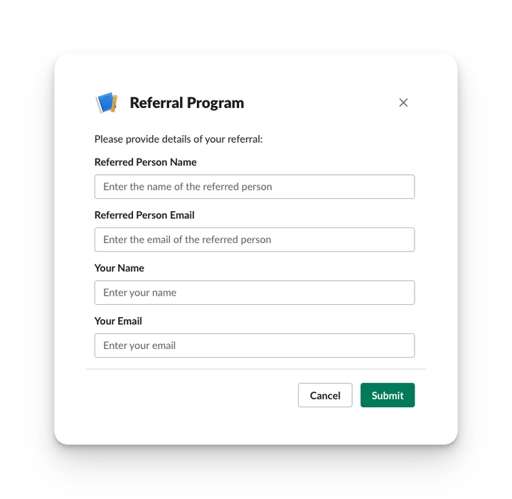 {"type":"modal","title":{"type":"plain_text","text":"Referral Program","emoji":true},"submit":{"type":"plain_text","text":"Submit","emoji":true},"close":{"type":"plain_text","text":"Cancel","emoji":true},"blocks":[{"type":"section","block_id":"referral_title","text":{"type":"mrkdwn","text":"Please provide details of your referral:"}},{"type":"input","block_id":"referral_name","element":{"type":"plain_text_input","action_id":"referral_name_input","placeholder":{"type":"plain_text","text":"Enter the name of the referred person","emoji":true}},"label":{"type":"plain_text","text":"Referred Person Name","emoji":true}},{"type":"input","block_id":"referral_email","element":{"type":"plain_text_input","action_id":"referral_email_input","placeholder":{"type":"plain_text","text":"Enter the email of the referred person","emoji":true}},"label":{"type":"plain_text","text":"Referred Person Email","emoji":true}},{"type":"input","block_id":"referrer_name","element":{"type":"plain_text_input","action_id":"referrer_name_input","placeholder":{"type":"plain_text","text":"Enter your name","emoji":true}},"label":{"type":"plain_text","text":"Your Name","emoji":true}},{"type":"input","block_id":"referrer_email","element":{"type":"plain_text_input","action_id":"referrer_email_input","placeholder":{"type":"plain_text","text":"Enter your email","emoji":true}},"label":{"type":"plain_text","text":"Your Email","emoji":true}}]}About Forms for Slack