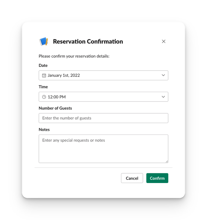 {"type":"modal","title":{"type":"plain_text","text":"Reservation Confirmation","emoji":true},"submit":{"type":"plain_text","text":"Confirm","emoji":true},"close":{"type":"plain_text","text":"Cancel","emoji":true},"blocks":[{"type":"section","block_id":"reservation_details","text":{"type":"mrkdwn","text":"Please confirm your reservation details:"}},{"type":"input","block_id":"reservation_date","element":{"type":"datepicker","initial_date":"2022-01-01","placeholder":{"type":"plain_text","text":"Select a date","emoji":true}},"label":{"type":"plain_text","text":"Date","emoji":true}},{"type":"input","block_id":"reservation_time","element":{"type":"timepicker","initial_time":"12:00","placeholder":{"type":"plain_text","text":"Select a time","emoji":true}},"label":{"type":"plain_text","text":"Time","emoji":true}},{"type":"input","block_id":"reservation_guests","element":{"type":"plain_text_input","action_id":"reservation_guests_input","placeholder":{"type":"plain_text","text":"Enter the number of guests","emoji":true}},"label":{"type":"plain_text","text":"Number of Guests","emoji":true}},{"type":"input","block_id":"reservation_notes","element":{"type":"plain_text_input","action_id":"reservation_notes_input","multiline":true,"placeholder":{"type":"plain_text","text":"Enter any special requests or notes","emoji":true}},"label":{"type":"plain_text","text":"Notes","emoji":true}}]}About Forms for Slack