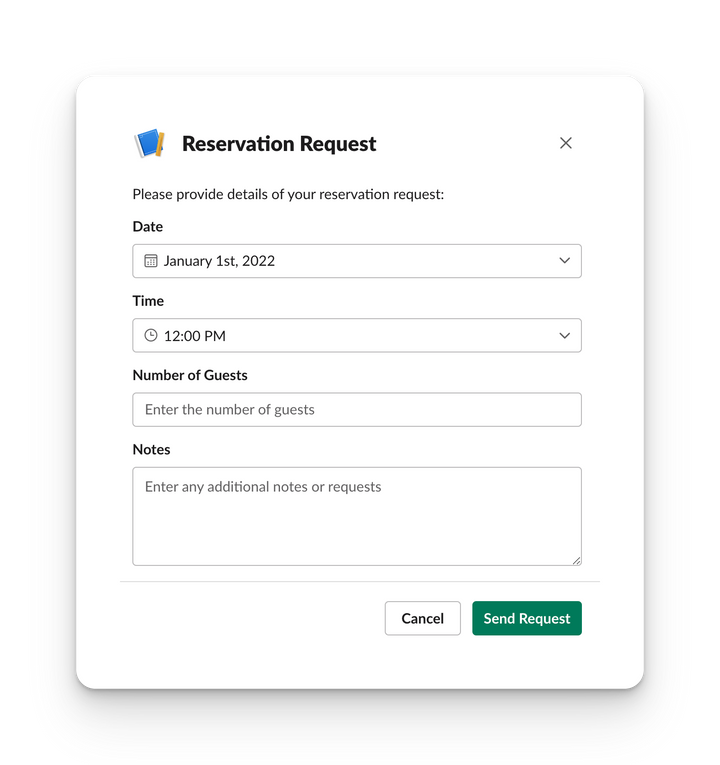 {"type":"modal","title":{"type":"plain_text","text":"Reservation Request","emoji":true},"submit":{"type":"plain_text","text":"Send Request","emoji":true},"close":{"type":"plain_text","text":"Cancel","emoji":true},"blocks":[{"type":"section","block_id":"reservation_details","text":{"type":"mrkdwn","text":"Please provide details of your reservation request:"}},{"type":"input","block_id":"reservation_date","element":{"type":"datepicker","initial_date":"2022-01-01","placeholder":{"type":"plain_text","text":"Select a date","emoji":true}},"label":{"type":"plain_text","text":"Date","emoji":true}},{"type":"input","block_id":"reservation_time","element":{"type":"timepicker","initial_time":"12:00","placeholder":{"type":"plain_text","text":"Select a time","emoji":true}},"label":{"type":"plain_text","text":"Time","emoji":true}},{"type":"input","block_id":"reservation_guests","element":{"type":"plain_text_input","action_id":"reservation_guests_input","placeholder":{"type":"plain_text","text":"Enter the number of guests","emoji":true}},"label":{"type":"plain_text","text":"Number of Guests","emoji":true}},{"type":"input","block_id":"reservation_notes","element":{"type":"plain_text_input","action_id":"reservation_notes_input","multiline":true,"placeholder":{"type":"plain_text","text":"Enter any additional notes or requests","emoji":true}},"label":{"type":"plain_text","text":"Notes","emoji":true}}]}About Forms for Slack