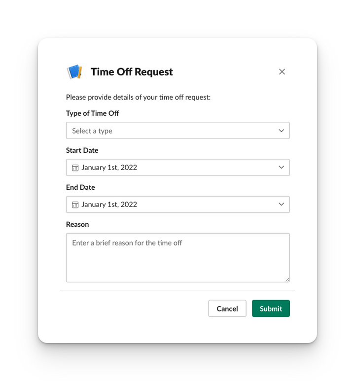 {"type":"modal","title":{"type":"plain_text","text":"Time Off Request","emoji":true},"submit":{"type":"plain_text","text":"Submit","emoji":true},"close":{"type":"plain_text","text":"Cancel","emoji":true},"blocks":[{"type":"section","block_id":"timeoff_title","text":{"type":"mrkdwn","text":"Please provide details of your time off request:"}},{"type":"input","block_id":"timeoff_type","element":{"type":"static_select","placeholder":{"type":"plain_text","text":"Select a type","emoji":true},"options":[{"text":{"type":"plain_text","text":"Vacation","emoji":true},"value":"vacation"},{"text":{"type":"plain_text","text":"Sick Leave","emoji":true},"value":"sick_leave"}]},"label":{"type":"plain_text","text":"Type of Time Off","emoji":true}},{"type":"input","block_id":"timeoff_start_date","element":{"type":"datepicker","initial_date":"2022-01-01","placeholder":{"type":"plain_text","text":"Select a date","emoji":true}},"label":{"type":"plain_text","text":"Start Date","emoji":true}},{"type":"input","block_id":"timeoff_end_date","element":{"type":"datepicker","initial_date":"2022-01-01","placeholder":{"type":"plain_text","text":"Select a date","emoji":true}},"label":{"type":"plain_text","text":"End Date","emoji":true}},{"type":"input","block_id":"timeoff_reason","element":{"type":"plain_text_input","action_id":"timeoff_reason_input","multiline":true,"placeholder":{"type":"plain_text","text":"Enter a brief reason for the time off","emoji":true}},"label":{"type":"plain_text","text":"Reason","emoji":true}}]}About Forms for Slack