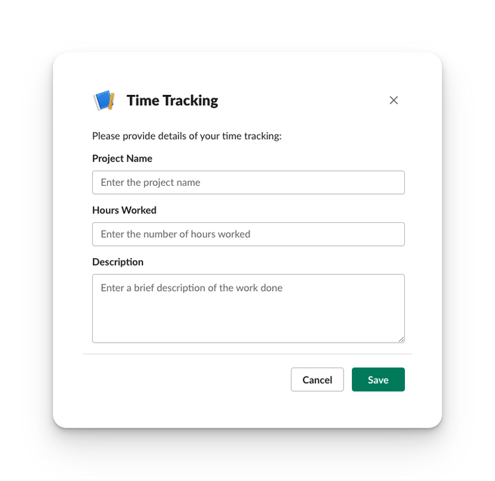 {"type":"modal","title":{"type":"plain_text","text":"Time Tracking","emoji":true},"submit":{"type":"plain_text","text":"Save","emoji":true},"close":{"type":"plain_text","text":"Cancel","emoji":true},"blocks":[{"type":"section","block_id":"time_tracking_title","text":{"type":"mrkdwn","text":"Please provide details of your time tracking:"}},{"type":"input","block_id":"time_tracking_project","element":{"type":"plain_text_input","action_id":"time_tracking_project_input","placeholder":{"type":"plain_text","text":"Enter the project name","emoji":true}},"label":{"type":"plain_text","text":"Project Name","emoji":true}},{"type":"input","block_id":"time_tracking_hours","element":{"type":"plain_text_input","action_id":"time_tracking_hours_input","placeholder":{"type":"plain_text","text":"Enter the number of hours worked","emoji":true}},"label":{"type":"plain_text","text":"Hours Worked","emoji":true}},{"type":"input","block_id":"time_tracking_description","element":{"type":"plain_text_input","action_id":"time_tracking_description_input","multiline":true,"placeholder":{"type":"plain_text","text":"Enter a brief description of the work done","emoji":true}},"label":{"type":"plain_text","text":"Description","emoji":true}}]}