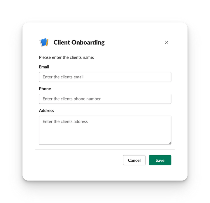 {"type":"modal","title":{"type":"plain_text","text":"Client Onboarding","emoji":true},"submit":{"type":"plain_text","text":"Save","emoji":true},"close":{"type":"plain_text","text":"Cancel","emoji":true},"blocks":[{"type":"section","block_id":"client_name","text":{"type":"mrkdwn","text":"Please enter the clients name:"}},{"type":"input","block_id":"client_email","element":{"type":"plain_text_input","action_id":"client_email_input","placeholder":{"type":"plain_text","text":"Enter the clients email","emoji":true}},"label":{"type":"plain_text","text":"Email","emoji":true}},{"type":"input","block_id":"client_phone","element":{"type":"plain_text_input","action_id":"client_phone_input","placeholder":{"type":"plain_text","text":"Enter the clients phone number","emoji":true}},"label":{"type":"plain_text","text":"Phone","emoji":true}},{"type":"input","block_id":"client_address","element":{"type":"plain_text_input","action_id":"client_address_input","multiline":true,"placeholder":{"type":"plain_text","text":"Enter the clients address","emoji":true}},"label":{"type":"plain_text","text":"Address","emoji":true}}]}