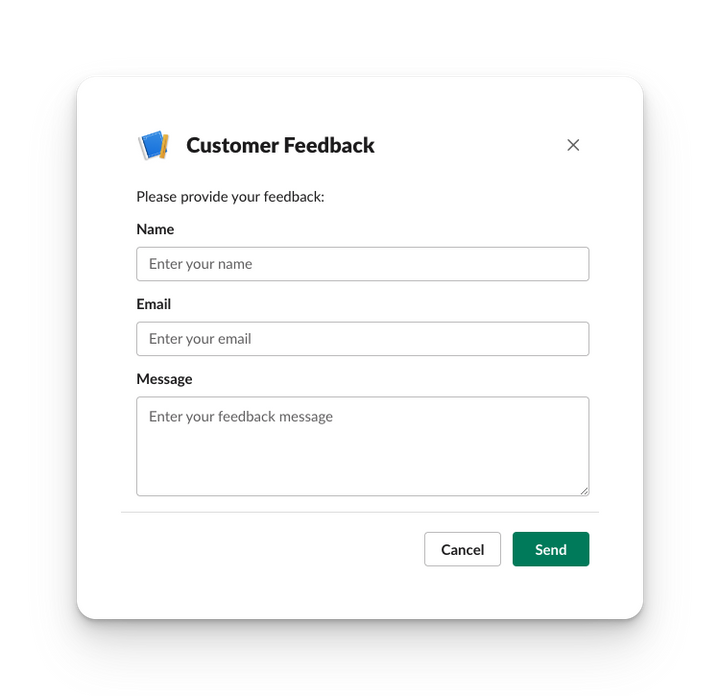 {"type":"modal","title":{"type":"plain_text","text":"Customer Feedback","emoji":true},"submit":{"type":"plain_text","text":"Send","emoji":true},"close":{"type":"plain_text","text":"Cancel","emoji":true},"blocks":[{"type":"section","block_id":"feedback_title","text":{"type":"mrkdwn","text":"Please provide your feedback:"}},{"type":"input","block_id":"feedback_name","element":{"type":"plain_text_input","action_id":"feedback_name_input","placeholder":{"type":"plain_text","text":"Enter your name","emoji":true}},"label":{"type":"plain_text","text":"Name","emoji":true}},{"type":"input","block_id":"feedback_email","element":{"type":"plain_text_input","action_id":"feedback_email_input","placeholder":{"type":"plain_text","text":"Enter your email","emoji":true}},"label":{"type":"plain_text","text":"Email","emoji":true}},{"type":"input","block_id":"feedback_message","element":{"type":"plain_text_input","action_id":"feedback_message_input","multiline":true,"placeholder":{"type":"plain_text","text":"Enter your feedback message","emoji":true}},"label":{"type":"plain_text","text":"Message","emoji":true}}]}