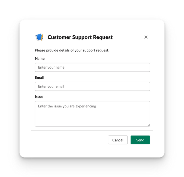 {"type":"modal","title":{"type":"plain_text","text":"Customer Support Request","emoji":true},"submit":{"type":"plain_text","text":"Send","emoji":true},"close":{"type":"plain_text","text":"Cancel","emoji":true},"blocks":[{"type":"section","block_id":"support_request_title","text":{"type":"mrkdwn","text":"Please provide details of your support request:"}},{"type":"input","block_id":"support_request_name","element":{"type":"plain_text_input","action_id":"support_request_name_input","placeholder":{"type":"plain_text","text":"Enter your name","emoji":true}},"label":{"type":"plain_text","text":"Name","emoji":true}},{"type":"input","block_id":"support_request_email","element":{"type":"plain_text_input","action_id":"support_request_email_input","placeholder":{"type":"plain_text","text":"Enter your email","emoji":true}},"label":{"type":"plain_text","text":"Email","emoji":true}},{"type":"input","block_id":"support_request_issue","element":{"type":"plain_text_input","action_id":"support_request_issue_input","multiline":true,"placeholder":{"type":"plain_text","text":"Enter the issue you are experiencing","emoji":true}},"label":{"type":"plain_text","text":"Issue","emoji":true}}]}About Forms for Slack
