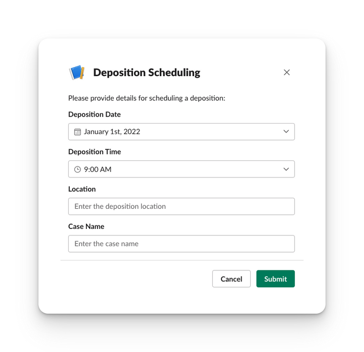 Add the Deposition Scheduling form to your workspace to update it's title, add more inputs and change how it's used in by your team in Slack.