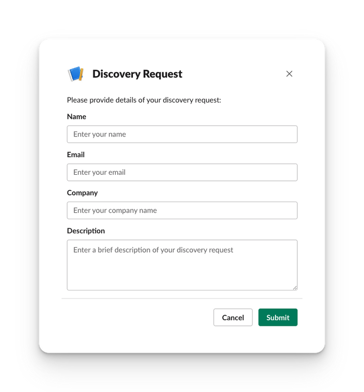 Streamline your discovery requests with Forms for Slack! Use this modal to provide details of your request, including your name, email, company, and a brief description. Submit your request with ease and get the information you need faster.