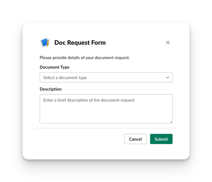 Streamline your document requests with Forms for Slack! Our Doc Request Form allows you to easily provide details of your request, select a document type, and enter a brief description. Submitting your request has never been easier!