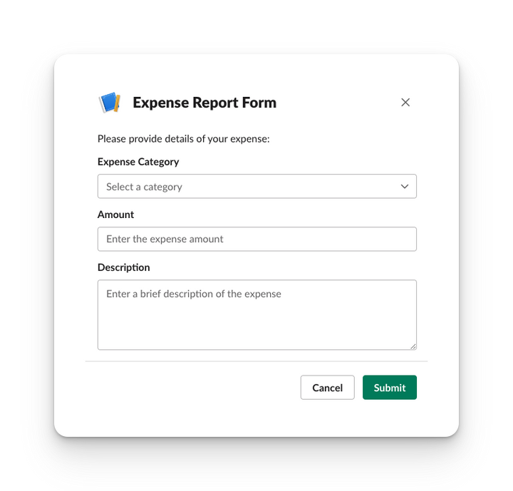 {"type":"modal","title":{"type":"plain_text","text":"Expense Report Form","emoji":true},"submit":{"type":"plain_text","text":"Submit","emoji":true},"close":{"type":"plain_text","text":"Cancel","emoji":true},"blocks":[{"type":"section","block_id":"expense_title","text":{"type":"mrkdwn","text":"Please provide details of your expense:"}},{"type":"input","block_id":"expense_category","element":{"type":"static_select","placeholder":{"type":"plain_text","text":"Select a category","emoji":true},"options":[{"text":{"type":"plain_text","text":"Travel","emoji":true},"value":"travel"},{"text":{"type":"plain_text","text":"Supplies","emoji":true},"value":"supplies"}]},"label":{"type":"plain_text","text":"Expense Category","emoji":true}},{"type":"input","block_id":"expense_amount","element":{"type":"plain_text_input","action_id":"expense_amount_input","placeholder":{"type":"plain_text","text":"Enter the expense amount","emoji":true}},"label":{"type":"plain_text","text":"Amount","emoji":true}},{"type":"input","block_id":"expense_description","element":{"type":"plain_text_input","action_id":"expense_description_input","multiline":true,"placeholder":{"type":"plain_text","text":"Enter a brief description of the expense","emoji":true}},"label":{"type":"plain_text","text":"Description","emoji":true}}]}