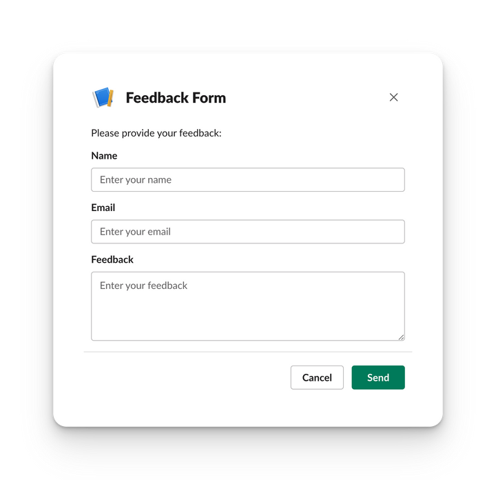 {"type":"modal","title":{"type":"plain_text","text":"Feedback Form","emoji":true},"submit":{"type":"plain_text","text":"Send","emoji":true},"close":{"type":"plain_text","text":"Cancel","emoji":true},"blocks":[{"type":"section","block_id":"feedback_title","text":{"type":"mrkdwn","text":"Please provide your feedback:"}},{"type":"input","block_id":"feedback_name","element":{"type":"plain_text_input","action_id":"feedback_name_input","placeholder":{"type":"plain_text","text":"Enter your name","emoji":true}},"label":{"type":"plain_text","text":"Name","emoji":true}},{"type":"input","block_id":"feedback_email","element":{"type":"plain_text_input","action_id":"feedback_email_input","placeholder":{"type":"plain_text","text":"Enter your email","emoji":true}},"label":{"type":"plain_text","text":"Email","emoji":true}},{"type":"input","block_id":"feedback_message","element":{"type":"plain_text_input","action_id":"feedback_message_input","multiline":true,"placeholder":{"type":"plain_text","text":"Enter your feedback","emoji":true}},"label":{"type":"plain_text","text":"Feedback","emoji":true}}]}About Forms for Slack