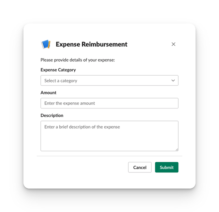 {"type":"modal","title":{"type":"plain_text","text":"Expense Reimbursement","emoji":true},"submit":{"type":"plain_text","text":"Submit","emoji":true},"close":{"type":"plain_text","text":"Cancel","emoji":true},"blocks":[{"type":"section","block_id":"expense_title","text":{"type":"mrkdwn","text":"Please provide details of your expense:"}},{"type":"input","block_id":"expense_category","element":{"type":"static_select","placeholder":{"type":"plain_text","text":"Select a category","emoji":true},"options":[{"text":{"type":"plain_text","text":"Travel","emoji":true},"value":"travel"},{"text":{"type":"plain_text","text":"Supplies","emoji":true},"value":"supplies"}]},"label":{"type":"plain_text","text":"Expense Category","emoji":true}},{"type":"input","block_id":"expense_amount","element":{"type":"plain_text_input","action_id":"expense_amount_input","placeholder":{"type":"plain_text","text":"Enter the expense amount","emoji":true}},"label":{"type":"plain_text","text":"Amount","emoji":true}},{"type":"input","block_id":"expense_description","element":{"type":"plain_text_input","action_id":"expense_description_input","multiline":true,"placeholder":{"type":"plain_text","text":"Enter a brief description of the expense","emoji":true}},"label":{"type":"plain_text","text":"Description","emoji":true}}]}About Forms for Slack