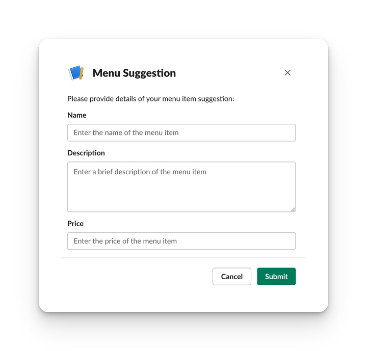 {"type":"modal","title":{"type":"plain_text","text":"Menu Suggestion","emoji":true},"submit":{"type":"plain_text","text":"Submit","emoji":true},"close":{"type":"plain_text","text":"Cancel","emoji":true},"blocks":[{"type":"section","block_id":"menu_title","text":{"type":"mrkdwn","text":"Please provide details of your menu item suggestion:"}},{"type":"input","block_id":"menu_name","element":{"type":"plain_text_input","action_id":"menu_name_input","placeholder":{"type":"plain_text","text":"Enter the name of the menu item","emoji":true}},"label":{"type":"plain_text","text":"Name","emoji":true}},{"type":"input","block_id":"menu_description","element":{"type":"plain_text_input","action_id":"menu_description_input","multiline":true,"placeholder":{"type":"plain_text","text":"Enter a brief description of the menu item","emoji":true}},"label":{"type":"plain_text","text":"Description","emoji":true}},{"type":"input","block_id":"menu_price","element":{"type":"plain_text_input","action_id":"menu_price_input","placeholder":{"type":"plain_text","text":"Enter the price of the menu item","emoji":true}},"label":{"type":"plain_text","text":"Price","emoji":true}}]}