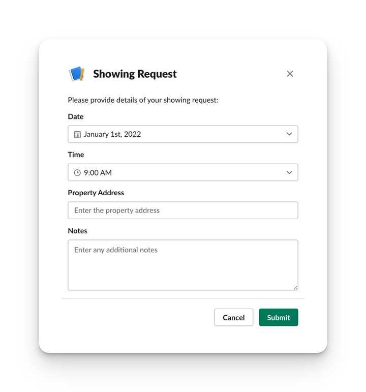 {"type":"modal","title":{"type":"plain_text","text":"Showing Request","emoji":true},"submit":{"type":"plain_text","text":"Submit","emoji":true},"close":{"type":"plain_text","text":"Cancel","emoji":true},"blocks":[{"type":"section","block_id":"request_title","text":{"type":"mrkdwn","text":"Please provide details of your showing request:"}},{"type":"input","block_id":"request_date","element":{"type":"datepicker","initial_date":"2022-01-01","placeholder":{"type":"plain_text","text":"Select a date","emoji":true}},"label":{"type":"plain_text","text":"Date","emoji":true}},{"type":"input","block_id":"request_time","element":{"type":"timepicker","initial_time":"09:00","placeholder":{"type":"plain_text","text":"Select a time","emoji":true}},"label":{"type":"plain_text","text":"Time","emoji":true}},{"type":"input","block_id":"request_property","element":{"type":"plain_text_input","action_id":"request_property_input","placeholder":{"type":"plain_text","text":"Enter the property address","emoji":true}},"label":{"type":"plain_text","text":"Property Address","emoji":true}},{"type":"input","block_id":"request_notes","element":{"type":"plain_text_input","action_id":"request_notes_input","multiline":true,"placeholder":{"type":"plain_text","text":"Enter any additional notes","emoji":true}},"label":{"type":"plain_text","text":"Notes","emoji":true}}]}About Forms for Slack